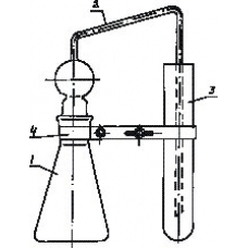Состоит из реакционной колбы 1, насадки 2, пробирки 3 с поглощающим раствором и держателя 4.